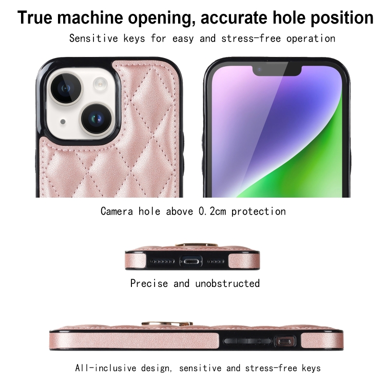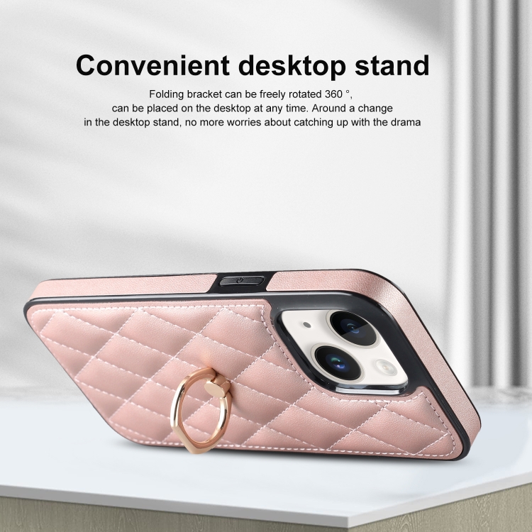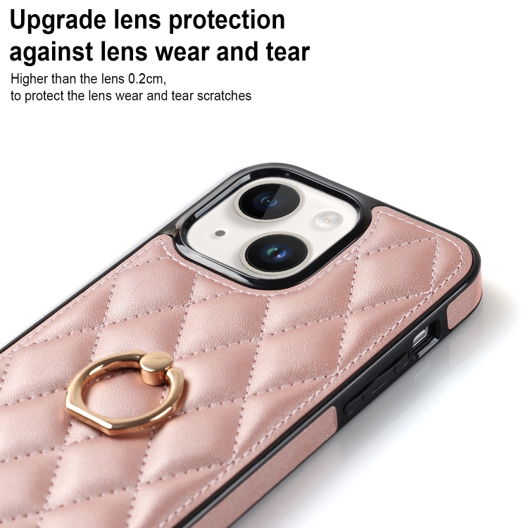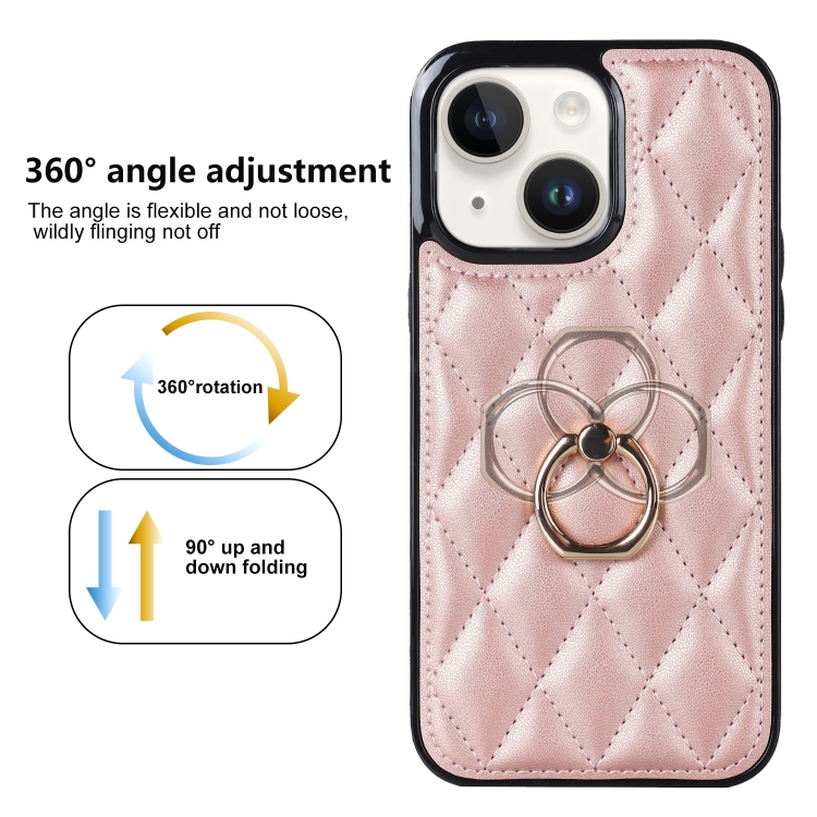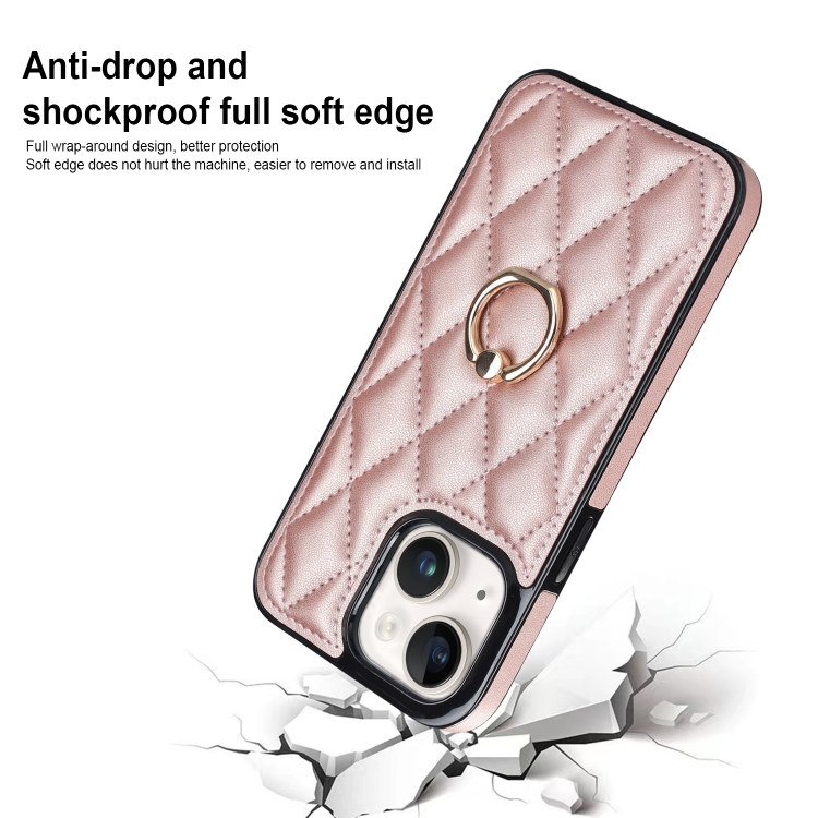 Estuche de teléfono iPhone 14 Cuero PU Rómbico con soporte para anillo (Oro Rosa)