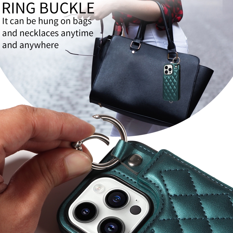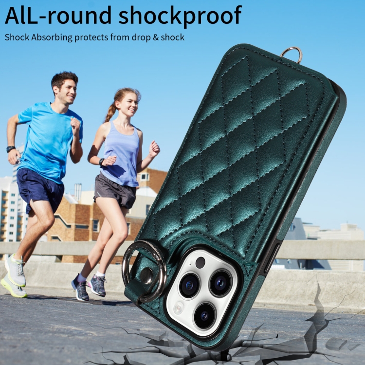 Estuche para Teléfono iPhone 14 Pro con Bolsa para Tarjetas Textura Rómbica y Cordón Corto (Verde)