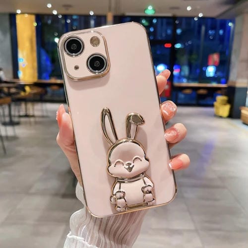 Estuche para teléfono iPhone 15 con soporte de conejo chapado (Rosa)