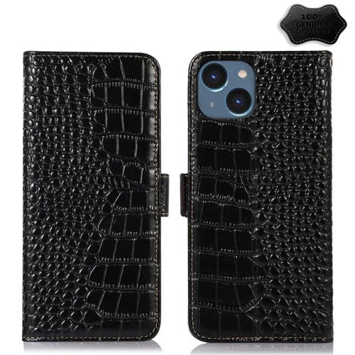 Estuche para Teléfono iPhone 15 Plus Cuero de Vaca con Capa Superior de Cocodrilo (Negro)