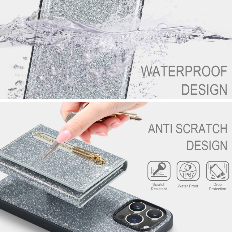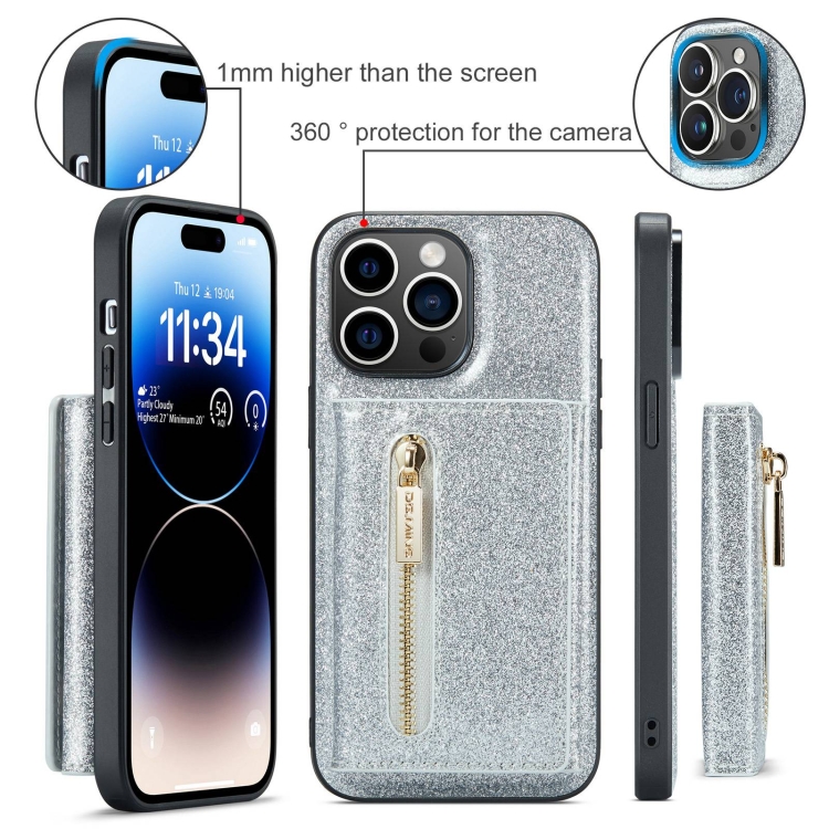 Funda de Cuero para Teléfono Dg.Ming M3 Series para iPhone 15 Pro con Glitter Powder y Porta Tarjetas (Plata)