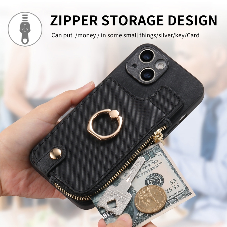 Funda para Teléfono iPhone 15 Pro con Anillo de Cuero Cruzado Cremallera Vertical y Billetera Trasera (Negro)