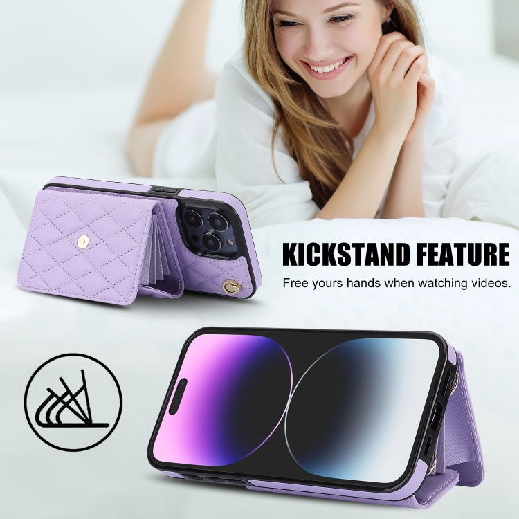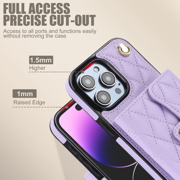 Pour iPhone 15 Pro Max Étui de téléphone en cuir portefeuille horizontal rhombique à bandoulière (violet)
