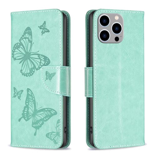 Pour iPhone 15 Pro Max Étui de téléphone en cuir à motif de deux papillons en relief (vert)