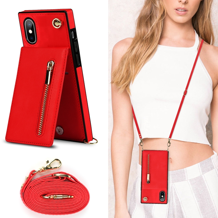 Funda Trasera para iPhone X / Xs Cross-Body Zipper Square TPU y Pu con soporte, ranuras para tarjetas, billetera y correa (Rojo)