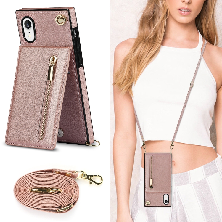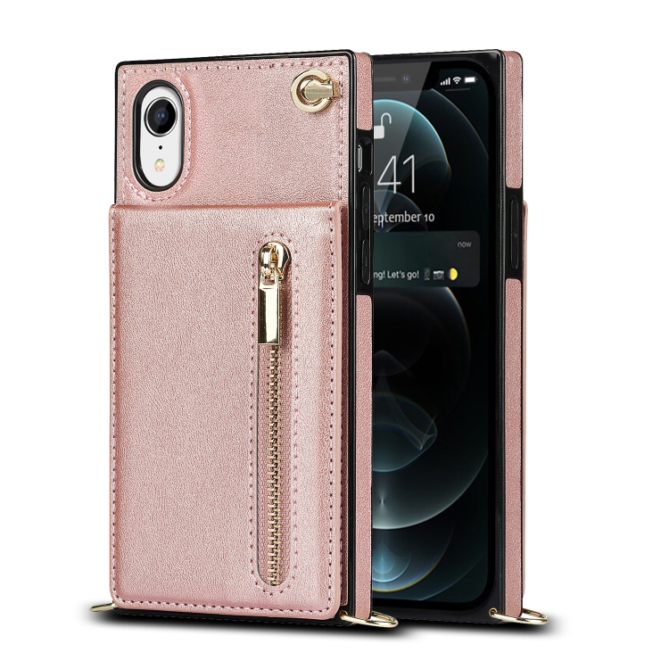 Funda Trasera para iPhone Xr Cross-Body Zipper Square TPU y PU con Soporte Ranuras para Tarjetas Billetera y Correa (Oro Rosa)
