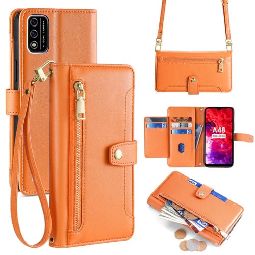 Funda para Itel A48 de Cuero con Billetera, Cremallera y Textura de Oveja (Naranja)