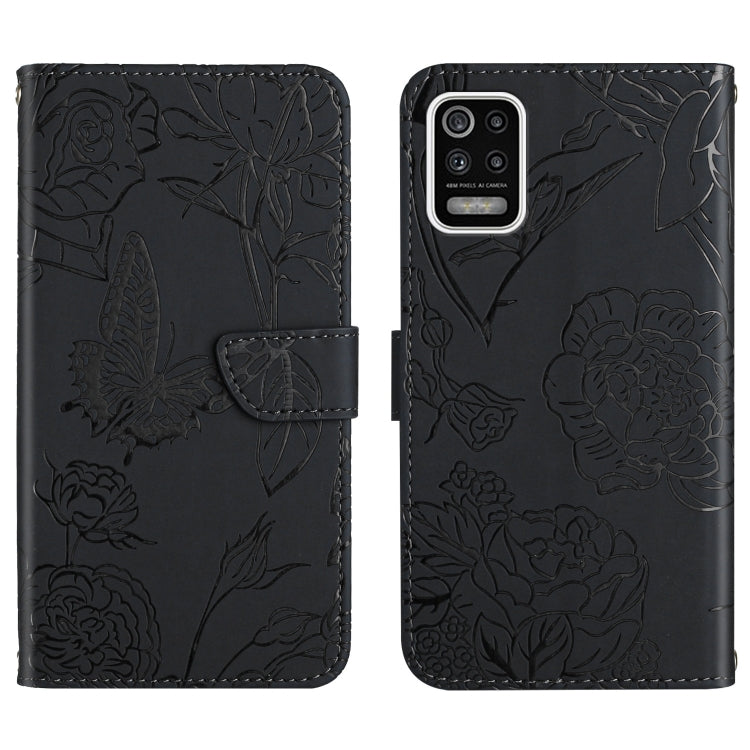 Funda para LG K42 Cuero en Relieve Peonía y Mariposa (Negro)