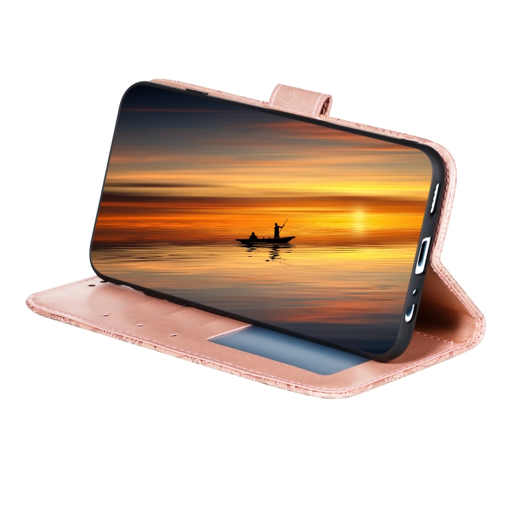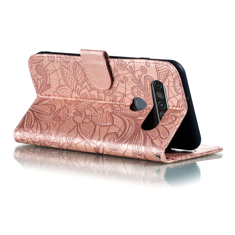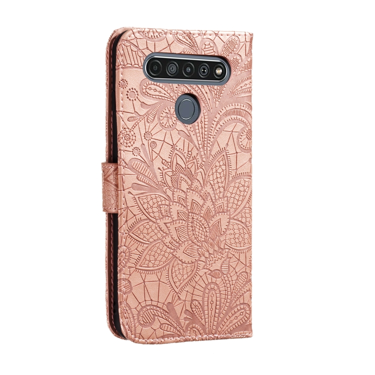 Funda de Cuero para LG K61 Lace Flower con Tapa Horizontal, Soporte, Ranuras para Tarjetas, Billetera y Marco de Fotos (Oro Rosa)
