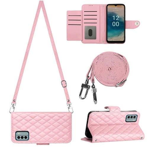 Funda de Cuero para Nokia G22 con Tapa Textura Rómbica y Cordón Largo (Rosa)