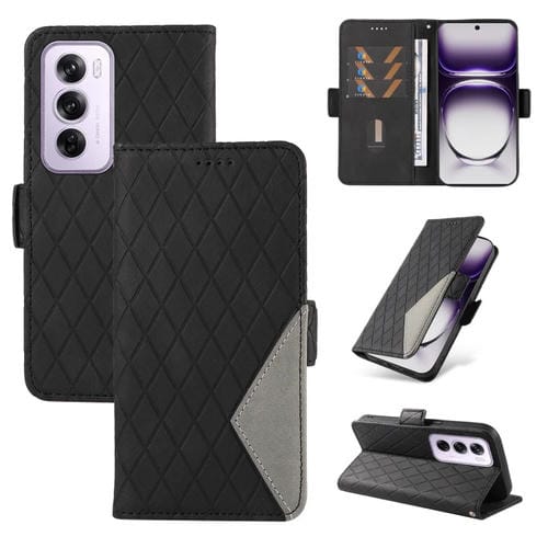Para Oppo Reno12 5G Global Funda de Cuero con Entramado Rómbico de Dos Colores (Negro)