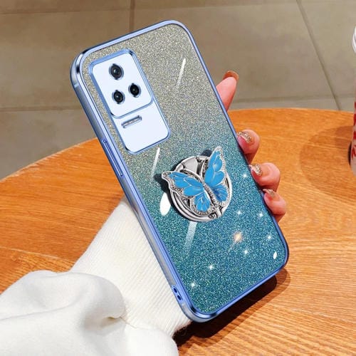 Para Redmi K40S Funda para Teléfono de TPU con Soporte de Mariposa con Brillo Degradado Plateado (Azul Sierra)