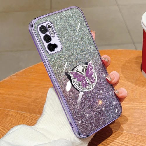 Para Redmi Note 10 5G Estuche para Teléfono de TPU con Soporte de Mariposa con Brillo Degradado Plateado (Púrpura)