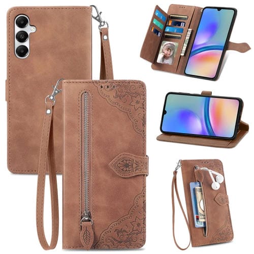 Funda para Samsung Galaxy A05S Cuero con Cremallera y Flores en Relieve (Marrón)