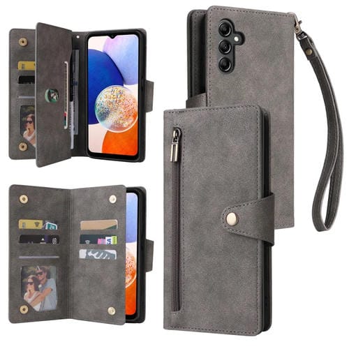 Funda de Cuero Samsung Galaxy A15 5G con Remache Hebilla y 9 Tarjetas Tres Pliegues (Gris)