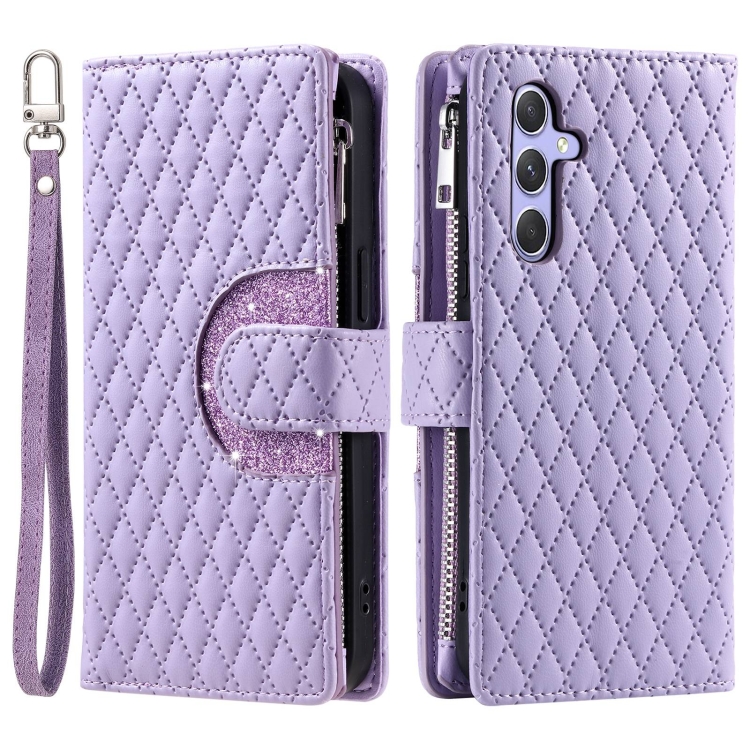 Estuche de Cuero para Samsung Galaxy A25 5G con Billetera, Cremallera y Celosía con Purpurina (Púrpura)