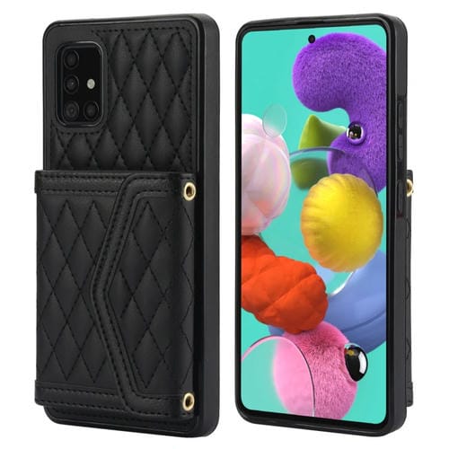 Estuche para Teléfono Samsung Galaxy A51 5G con Bolsa para Tarjetas Textura Rómbica y Cordón Largo (Negro)