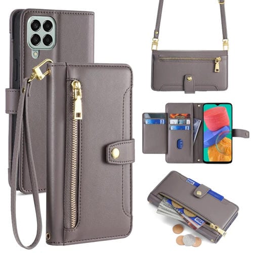 Funda para Samsung Galaxy M33 5G de Cuero con Billetera, Cremallera y Textura de Oveja (Gris)