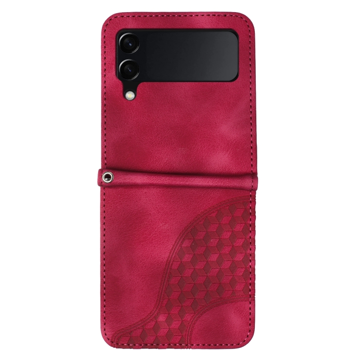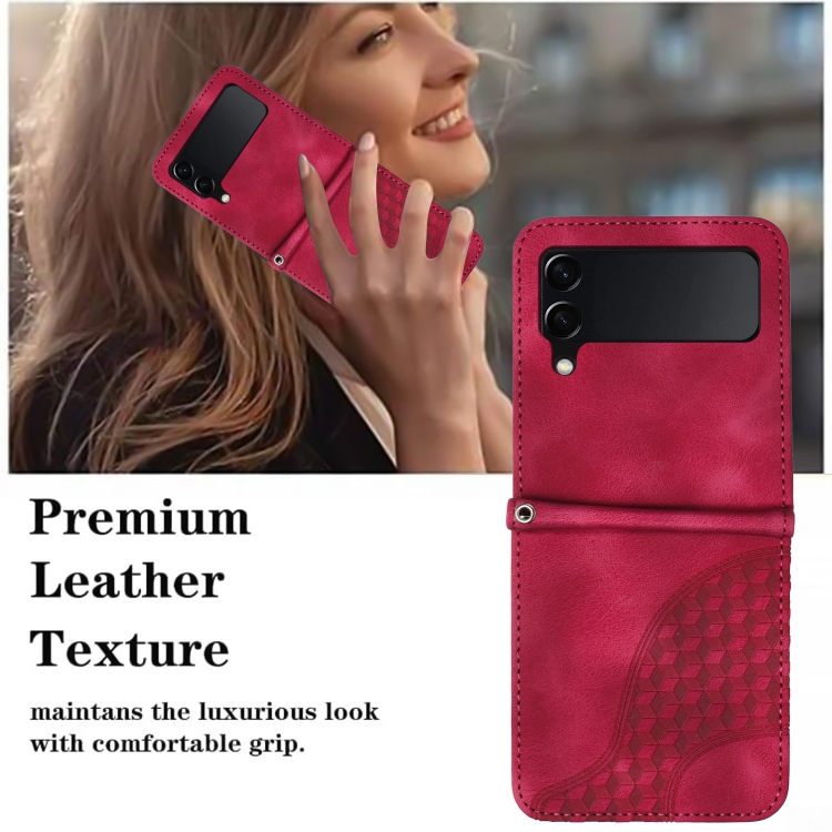 Funda de Cuero Samsung Galaxy Z Flip4 5G Yx0060 con Relieve y Cabeza de Elefante con Cordón (Rojo Rosa)