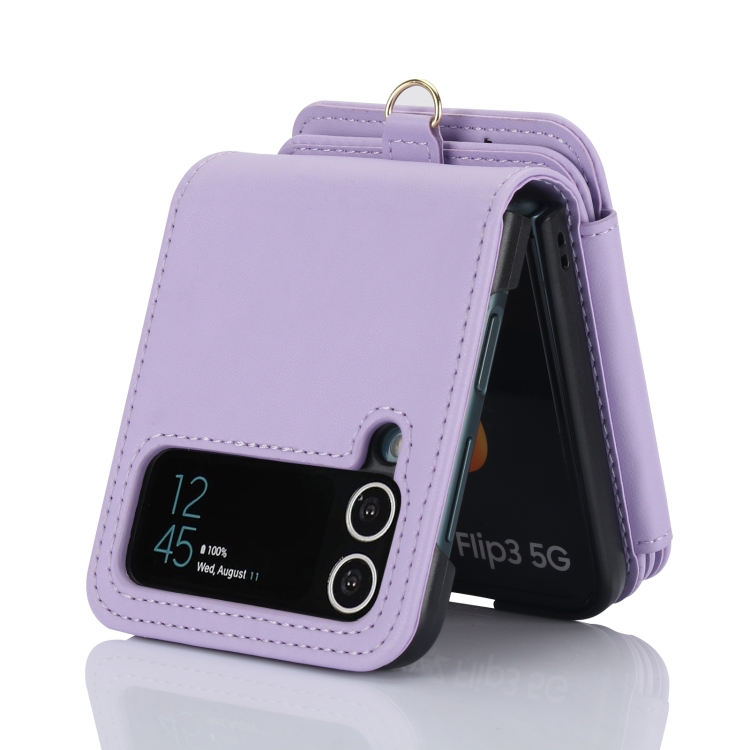 Estuche plegable para Samsung Galaxy Z Flip4 con ranuras para tarjetas y cremallera RFID con cordón largo (Púrpura Claro)