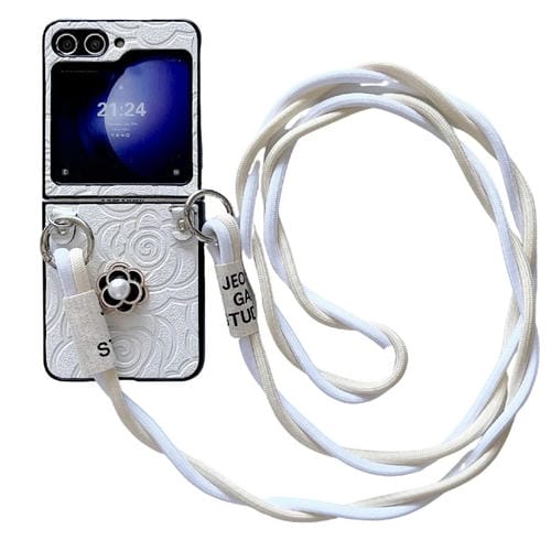 Funda Protectora Samsung Galaxy Z Flip5 5G con Patrón de Camelia y Cordón Largo (Blanco)
