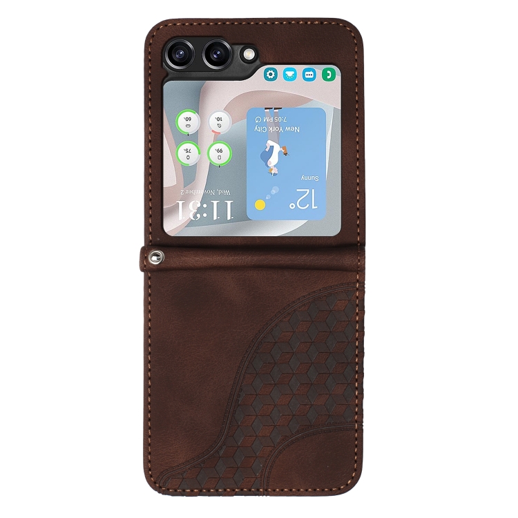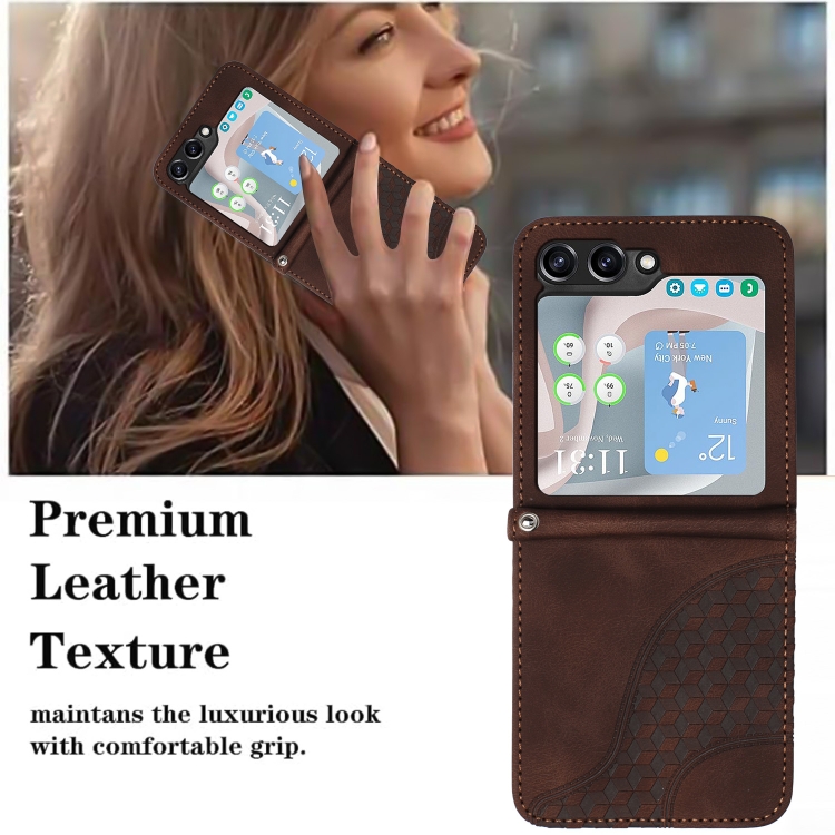 Funda para Samsung Galaxy Z Flip5 5G Yx0060 de Cuero con Relieve y Cabeza de Elefante con Cordón (Café)