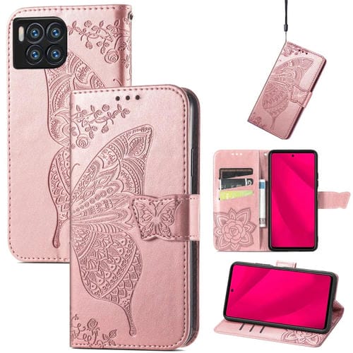 Funda para teléfono T-Mobile Revvl 7 Pro 5G cuero con relieve flor y mariposa (Oro Rosa)
