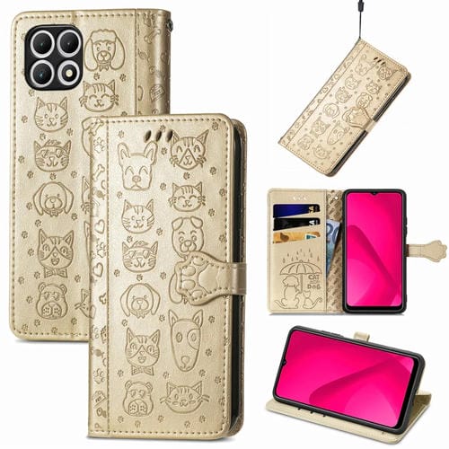 Funda de Cuero para T-Mobile T Phone 2 Pro 5G con Relieve de Perros y Gatos (Dorado)