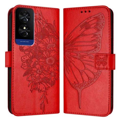 Funda de Cuero para TCL 50 5G con Mariposa en Relieve (Rojo)