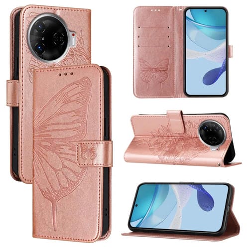 Funda de Cuero para Tecno Camon 30 Pro con Mariposa en Relieve (Oro Rosa)