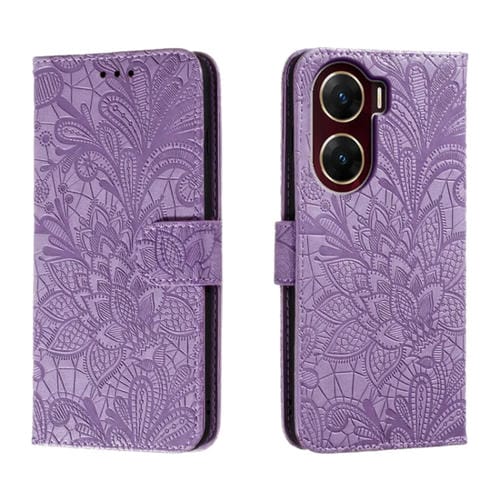 Para Vivo V29E Funda para Teléfono de Cuero con Tapa y Estampado de Flores de Encaje (Púrpura)