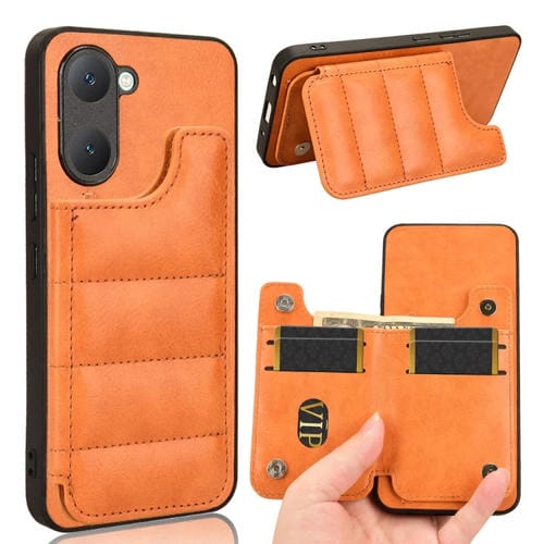 Para Vivo Y03 4G Funda para Teléfono con Bolsa para Tarjetas de Costura con Patrón de Vaca (Naranja)
