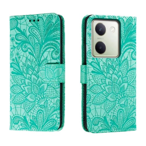 Para Vivo Y100 5G Funda para Teléfono de Cuero con Tapa y Estampado de Flores de Encaje (Verde)