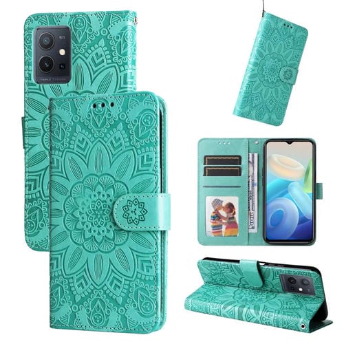 Para Vivo Y55 5G / Y75 5G / T1 5G Estuche para Teléfono de Cuero con Estampado de Girasol En Relieve (Verde)