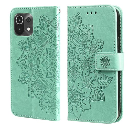 Para Xiaomi Mi 11 Lite 7-Petal Flores Patrón de Estampado de Estampado Horizontal Flip Pu Funda de Cuero con Soporte y Ranuras para Tarjetas y Marco de Fotos (Verde)