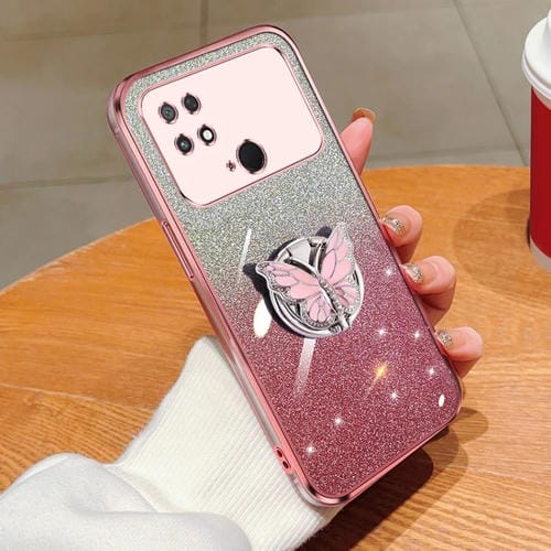 Para Xiaomi Poco C40 Funda para Teléfono de TPU con Soporte de Mariposa con Brillo Degradado Plateado (Rosa)