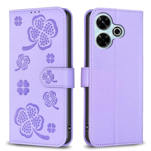 Para Xiaomi Poco M6 4G / Redmi 13 4G Funda para Teléfono de Cuero con Relieve de Cuatro Hojas (Púrpura)