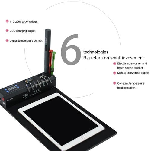 El separador de Vidrio modelo TBK-568R es un equipo profesional diseñado para la separación precisa y segura de Pantallas de dispositivos electrónicos, especialmente tablets y smartphones. Funciona con un sistema de vacío y cuenta con un controlador de temperatura LCD con Pantalla Táctil que permite ajustar la temperatura de trabajo hasta un máximo de 120 grados Celsius. Este dispositivo opera con un voltaje de 220V y está equipado con una almohadilla térmica Flexible y resistente a altas temperaturas que facilita la separación sin dañar los componentes. Además, incorpora una Caja de almacenamiento multifunción que ayuda a organizar las herramientas durante el proceso de reparación, optimizando el espacio de trabajo. Su tamaño compacto y peso ligero hacen que sea un equipo manejable y eficiente para usuarios que reparan por cuenta propia o técnicos especializados.