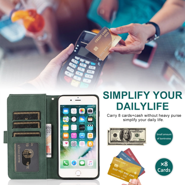 Funda de Cuero Skin-Feel Crazy Horse Texture Zipper Wallet Bag para iPhone 8 Plus 7 Plus con Tapa Horizontal Soporte Ranuras Verde Oscuro